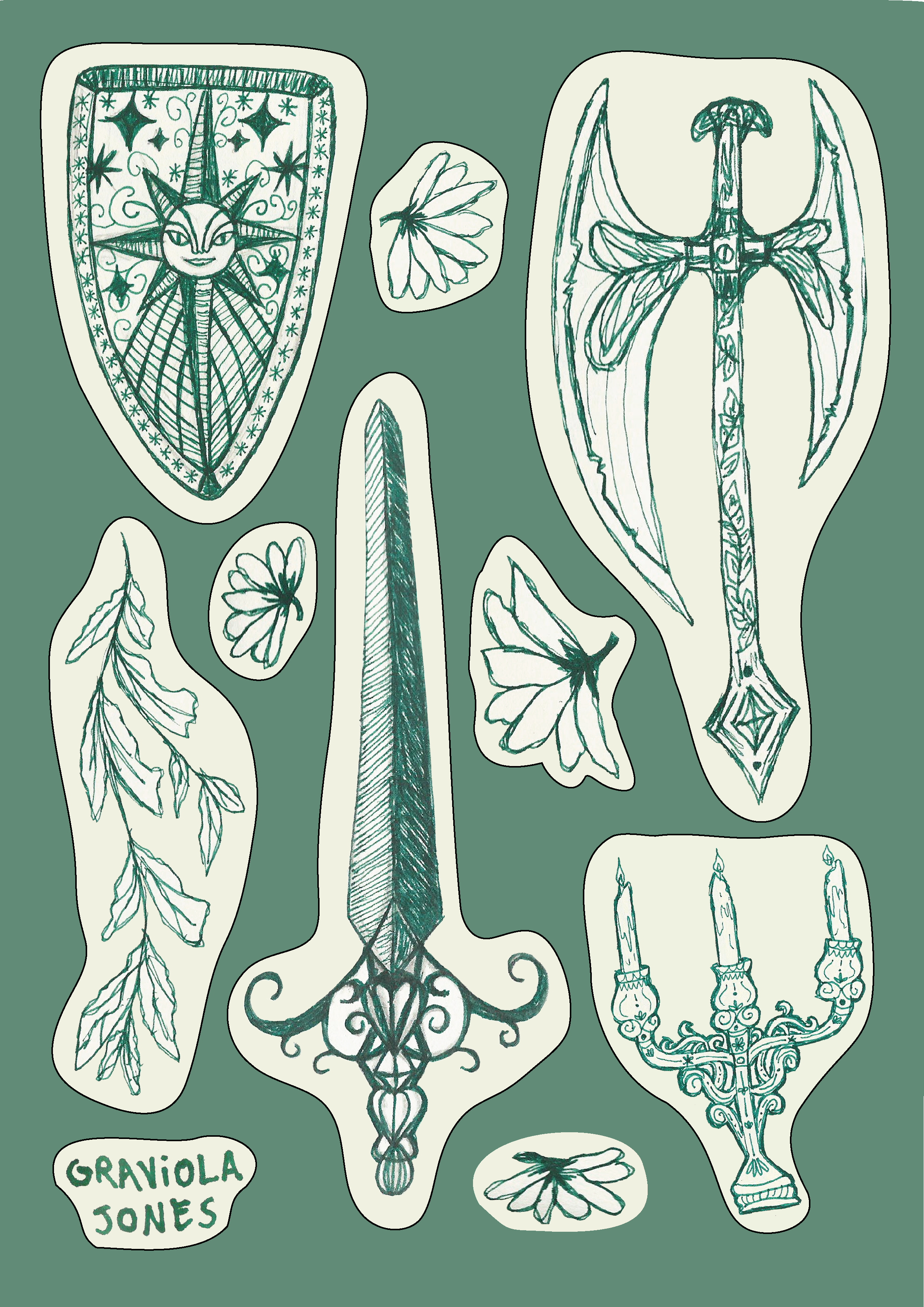 Gabriela Malato (vulgo Graviola Jones) é uma poetisa, musicista e artista multimídia habitante da zona leste de São Paulo. Com forte influência da subcultura gótica em suas obras, costuma retratar temas que se relacionem com a finitude da vida “memento mori”, amor e dor, música, e principalmente, natureza: seja humana, flora ou fauna. Explora diferentes linguagens visuais e materiais, atravessando imagem, matéria e palavra, investigando símbolos, memória e processos artesanais.